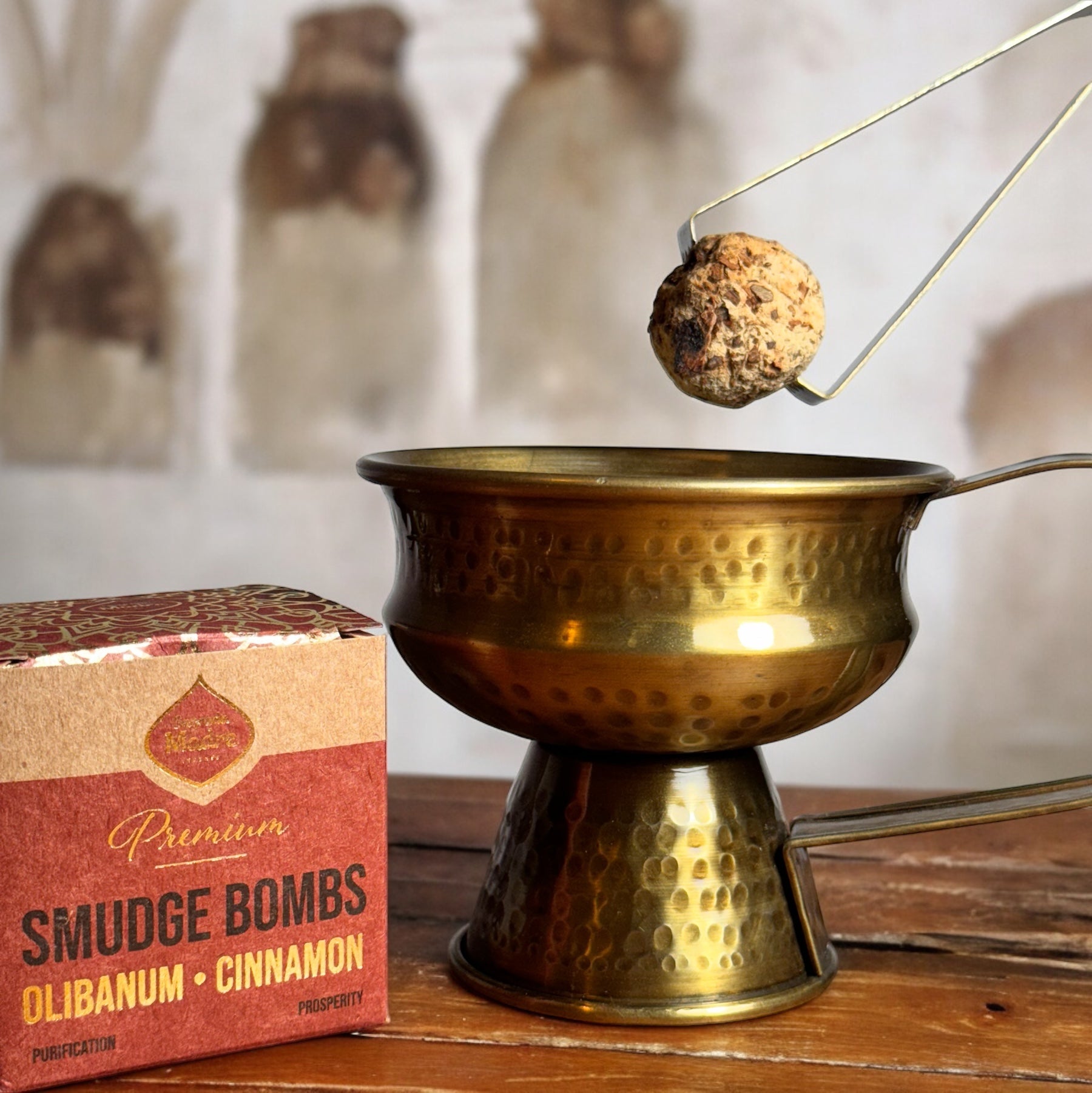 This elegant brass burner features a polished finish, a practical handle, and tongs for safe use. Ideal for various incense types, it ensures a clean and controlled burn.
